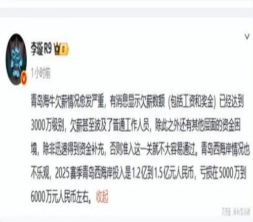 问题在于,奇迹并不能年年复制。2025赛季开始前,期待中的股改和新资金始终没能落地,球队再次深陷保级泥潭。虽然还是留在了中超,但同时也留下了更沉重的账单。欠薪已经不是零星问题,据一位足球媒体人透露,海牛欠薪的数额已经达到了3000万,连工作人员都被波及,准入成了摆在眼前的一道坎。即便地方的扶持资金到账,但区级的配套资金却迟迟不见影子,时间一拖,压力越来越大。