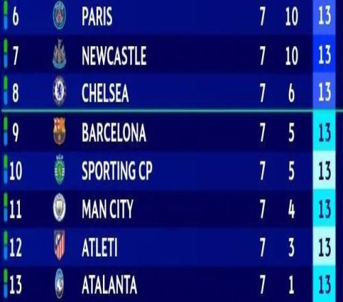 欧冠联赛积分榜上,第6名到第13名的球队全部积13分,依次是巴黎圣日耳曼、纽卡斯尔、切尔西、巴塞罗那、葡萄牙体育、曼城、马德里竞技以及亚特兰大。