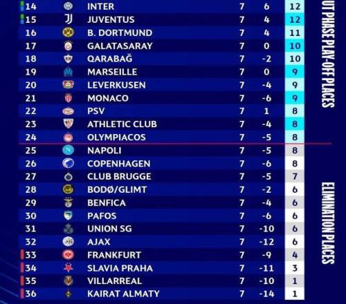 阿贾克斯(第32积6分)只有理论上的希望,荷甲豪门必须大胜奥林匹亚科斯(第24),还得指望前面至少七到八支球队全部输球,才有可能奇迹般地挤进前24。