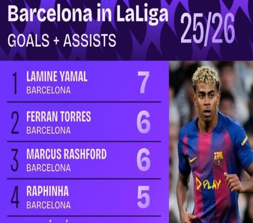巴萨5人西甲直接参与至少5球,本赛季五大联赛仅此一家 -